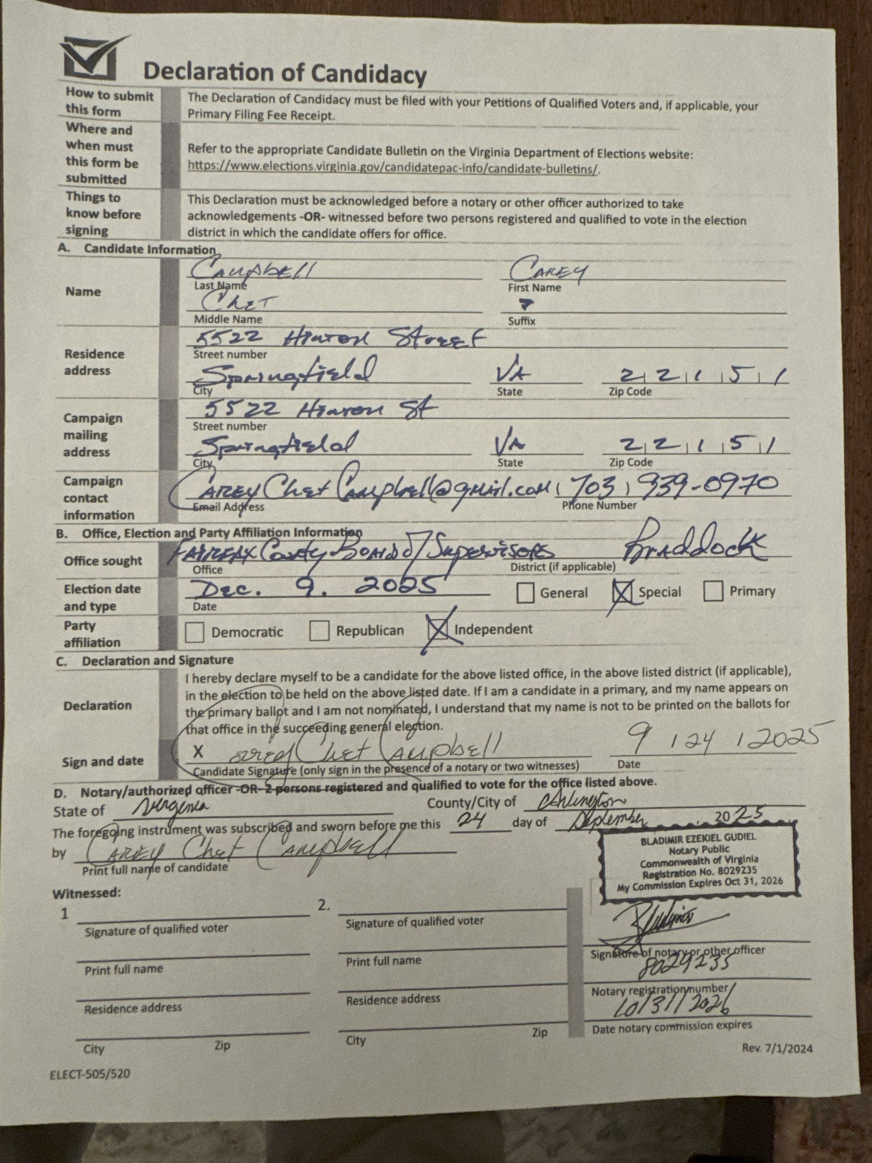 Carey Campbell Certified for Braddock District Supervisor Special Election Ballot: Independent Veteran and Community Leader